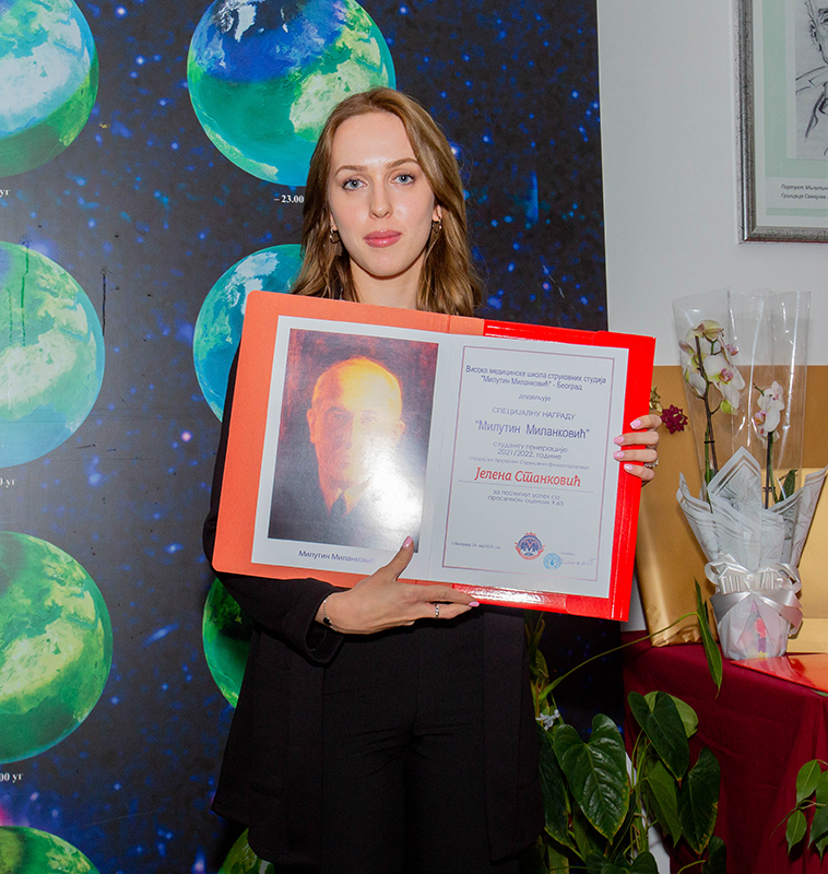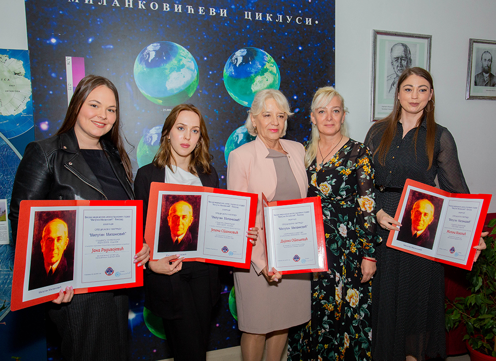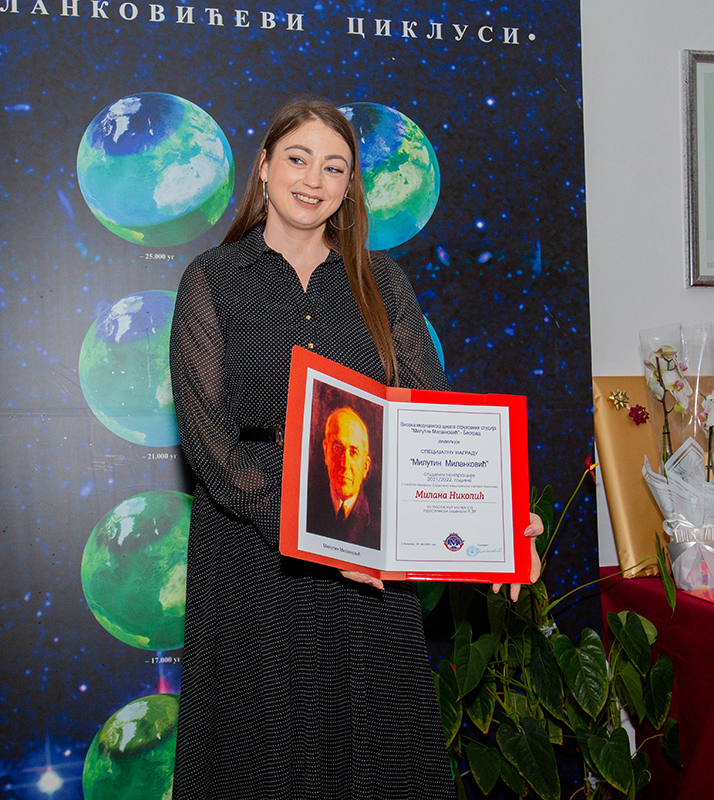 Специјалну награду „Милутин Миланковић“, студенту генерације 2021/2022.године на студијском програму , струковна медицинска сестра-техничар, добила је Милана Николић за постигнут успех са просечном оценом 9,39